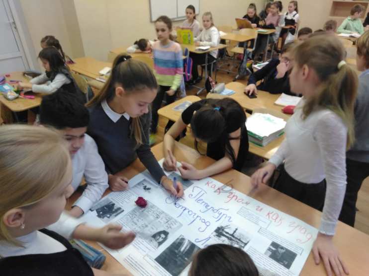 Я, как классный руководитель, со своими ребятами из 5-5 класса подготовили стенгазету ко Дню снятия блокады Ленинграда. Данная стенгазета была выставлена в фойе школы вместе с работами других классов. Название стенгазеты: «Это имя как гром и как град: Петербург, Петроград, Ленинград». В данной стенгазете представлены отрывки произведений Юрия Воронова: «Пытал нас враг железом и огнем... Ты сдашься, струсишь, — бомбы нам кричали, — Забьешься в землю, упадешь ничком. Дрожа, запросят плена, как пощады, Не только люди — камни Ленинграда!» Игоря Малышева: «Плакали люди, строчки читая, Плакали люди, фашизм проклиная. Танин дневник — это боль Ленинграда, Но прочитать его каждому надо. Словно кричит за страницей страница: «Вновь не должно это все повториться!»» Варвары Вольтман-Спасской: «Я в гору саночки толкаю. Ещё немного — и конец. Вода, в дороге замерзая, Тяжёлой стала, как свинец. Как хорошо, что ты замёрзла, Святая невская вода! Когда я поскользнусь под горкой, На той тропинке ледяной, Ты не прольёшься из ведёрка, Я привезу тебя домой.» Также в стенгазете представлена фотография из дневника Тани Савичевой и другие фотографии осажденного города. Оформлена стенгазета карандашами, гвоздиками из салфеток и георгиевской ленточкой.