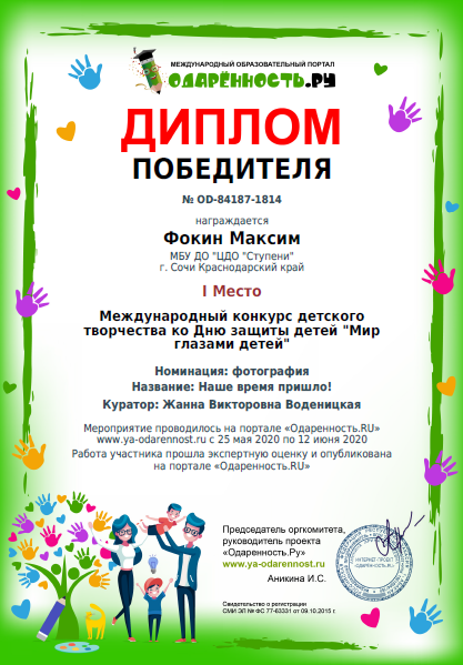 С огромным желанием принял участие в Международном конкурсе детского творчества ко Дню защиты детей «Мир глазами детей» в номинации Фотоколлаж «Наше время пришло: ВРЕМЯ ЗДОРОВЫХ, ВРЕМЯ СПОРТИВНЫХ, ВРЕМЯ АКТИВНЫХ, ВРЕМЯ ПОЗИТИВНЫХ!»