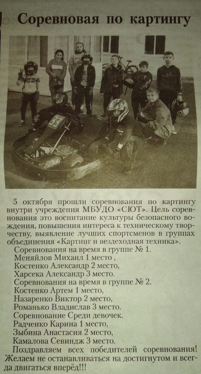 Добрый день! В нашем учреждении проходит много мероприятий. Традиционными стали соревнования по картингу, которые мы проводим внутри нашего учреждения. Ребята соревновались сначала каждый в своей группе, затем лучшие участвовали на первенство МБУ ДО "СЮТ".