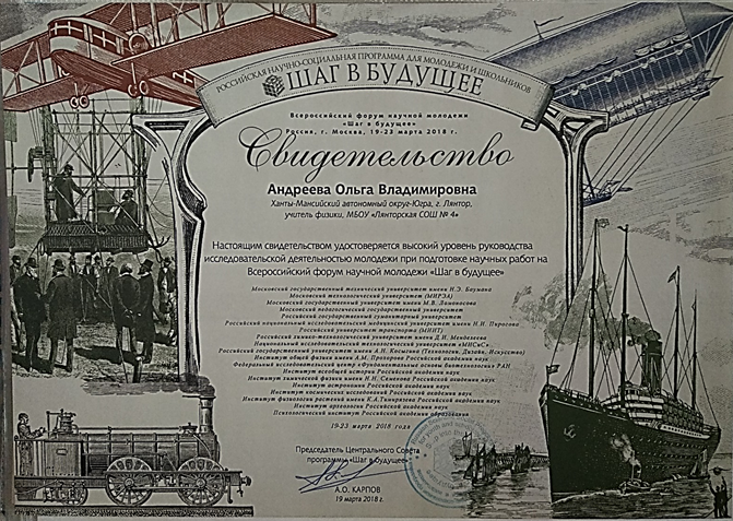 Свидетельство Всероссийского форума научной молодежи «Шаг в будущее» за высокий уровень руководства исследовательской деятельностью молодежи при подготовке научных работ. 2018 год.