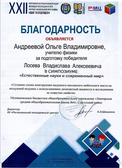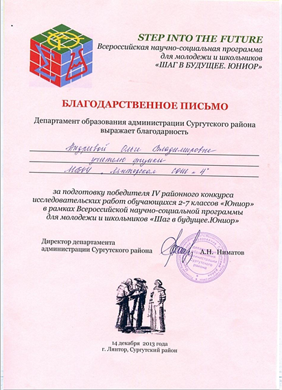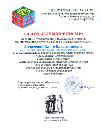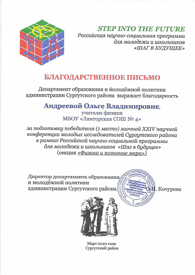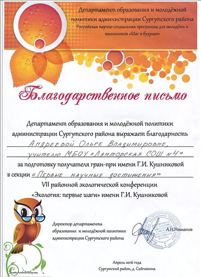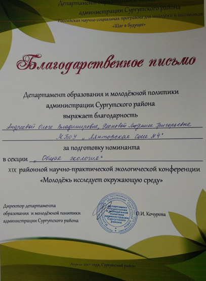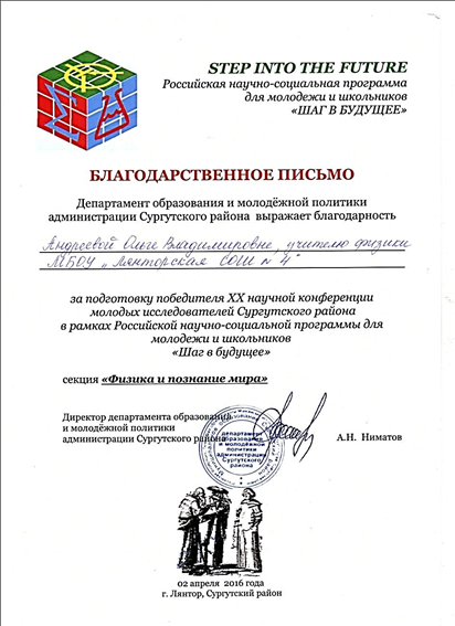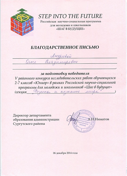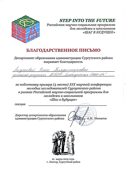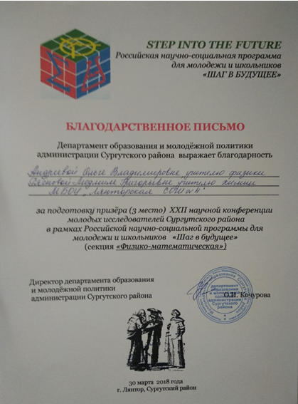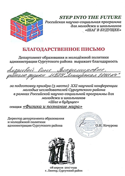 Благодарность окружной научной конференции молодых исследователей научно-социальной программы «Шаг в будущее» за подготовку победителя. 2017 год.