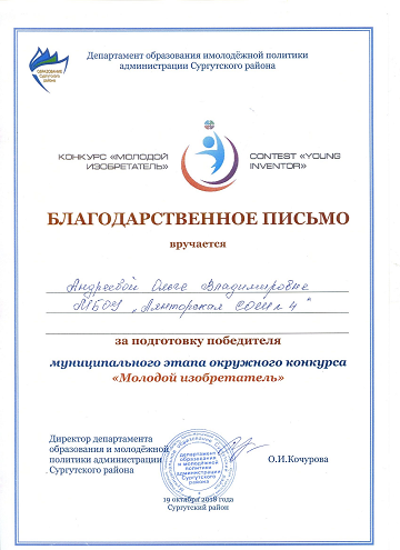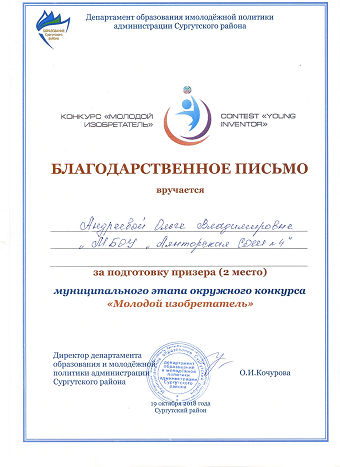 Благодарности за подготовку победителя и призера муниципального этапа окружного конкурса «Молодой изобретатель». 2018 год.