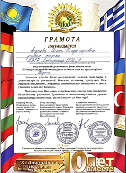 Грамота за подготовку дипломанта финального этапа X Международной олимпиады по основам наук. 2014 год.