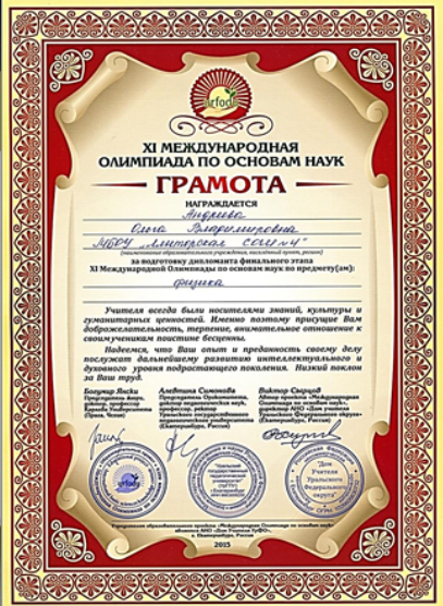 Грамота за подготовку дипломанта финального этапа X Международной олимпиады по основам наук. 2015 год.