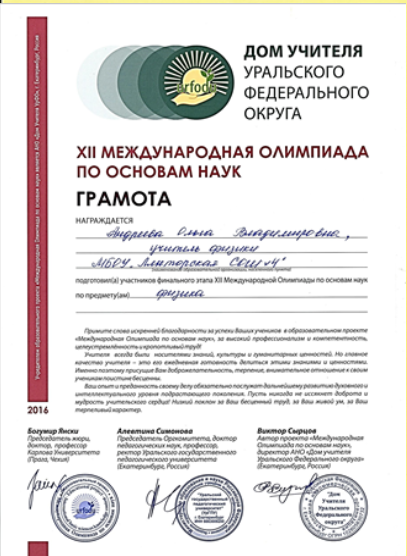 Грамота за подготовку участника финального этапа X Международной олимпиады по основам наук. 2016 год.