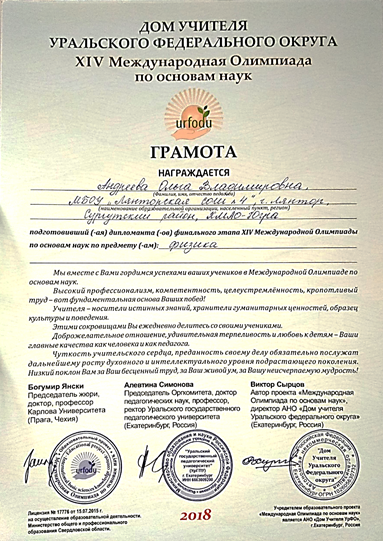 Грамота за подготовку дипломанта финального этапа X Международной олимпиады по основам наук. 2018 год.
