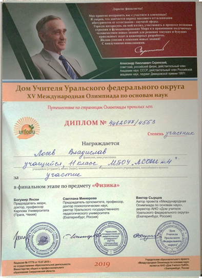 Диплом за подготовку участника финального этапа X Международной олимпиады по основам наук. 2019 год.