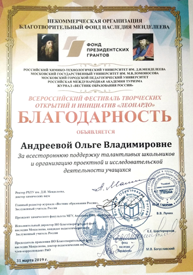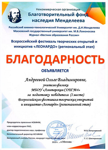 Благодарность Всероссийского фестиваля творческих открытий и инициатив «Леонардо» за всестороннюю поддержку талантливых школьников и организацию проектной и исследовательской деятельности учащихся. 2019 год.