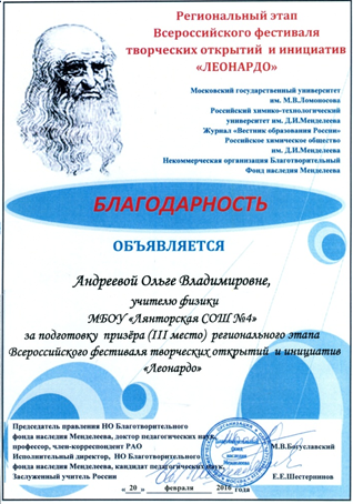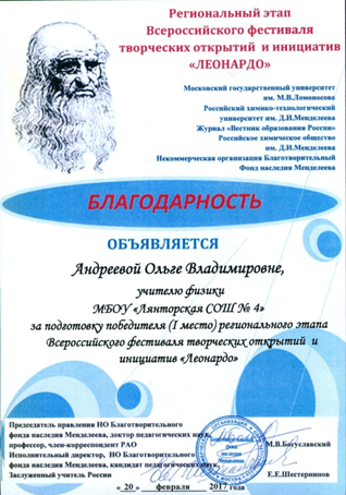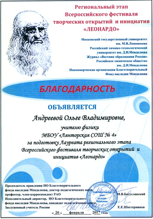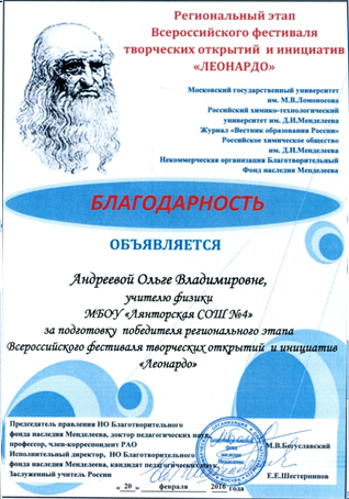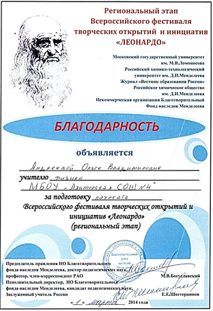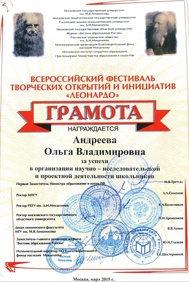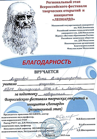 Благодарность Всероссийского фестиваля творческих открытий и инициатив «Леонардо» за успехи в организации проектной и исследовательской деятельности учащихся. 2015 год.