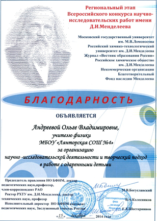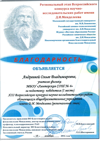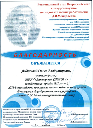 Благодарности за подготовку победителей и призеров регионального этапа Всероссийского конкурса научно-исследовательских работ имени Д. И. Менделеева. 2014-2016 годы.