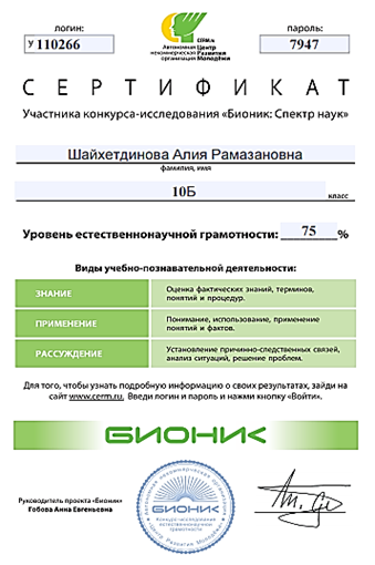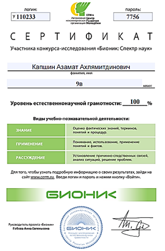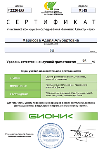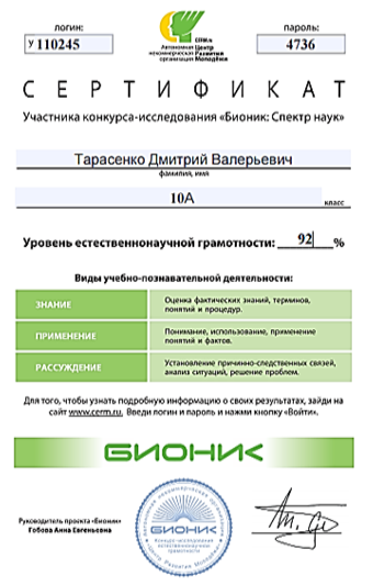 Сертификаты участия учащихся в конкурсе-исследовании «Бионик: Спектр наук», определяющем уровень естественно-научной грамотности школьников. 2017-2018 год.