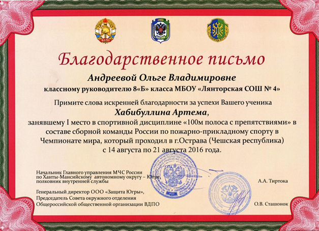 Благодарственное письмо начальника Главного управления МЧС России по ХМАО - Югре. 2016 год.