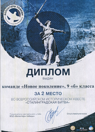 Диплом Центрального штаба ВОД "Волонтеры победы" призеру Всероссийского исторического квеста "Сталинградская битва". 2018 год.