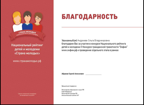 Диплом организатора проекта "Страна молодых" за активное участие в организации конкурса гражданской грамотности "Онфим". 2016 год.
