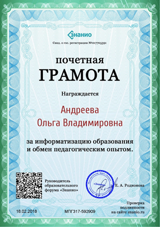 Почетная грамота образовательного форума "Знанио" за информатизацию образования и обмен педагогическим опытом. 2018 год.