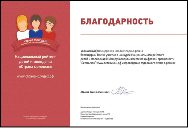 Диплом организатора проекта "Страна молодых" за активное участие в организации конкурса цифровой грамотности "Сетевичок". 2017 год.