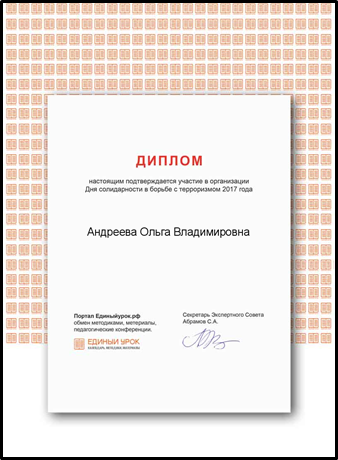 Диплом портала "Единый урок" за участие в организации Дня солидарности в борьбе с терроризмом. 2017 год.