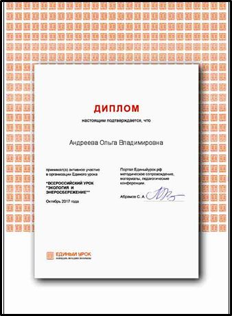 Диплом портала "Единый урок" за активное участие в организации Единого урока "Всероссийский урок "Экология и энергосбережение"". 2017 год.