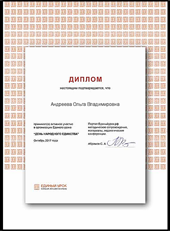 Диплом портала "Единый урок" за активное участие в организации Единого урока "День народного единства". 2017 год.