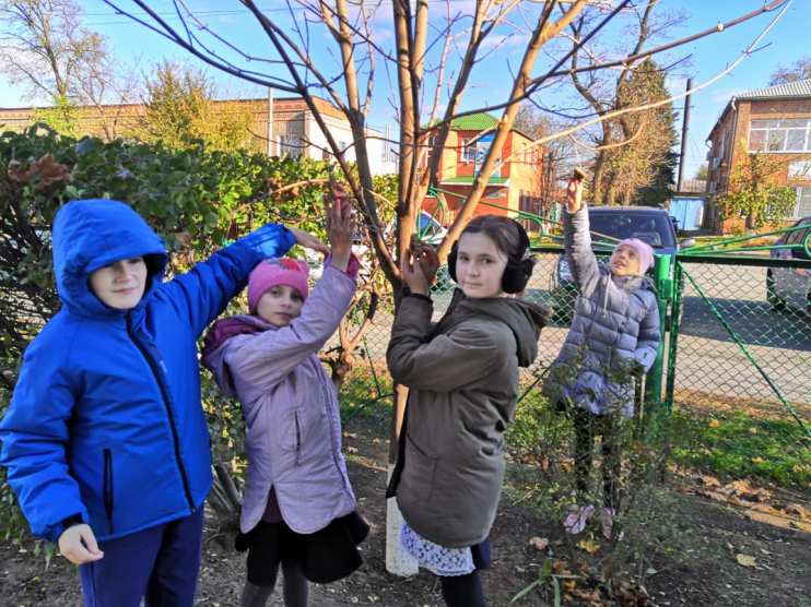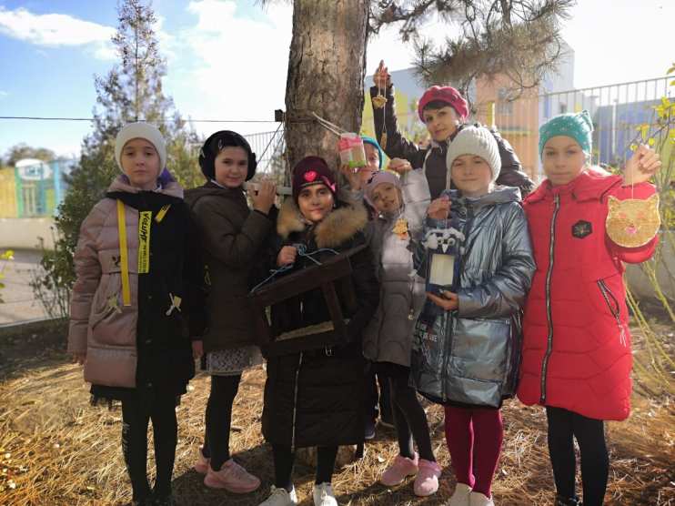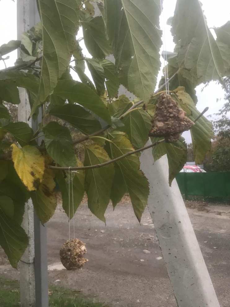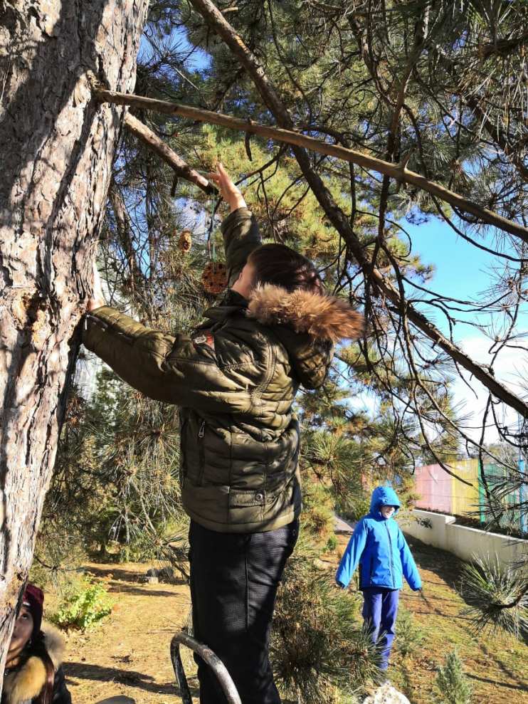 После классного часа мы с ребятами вышли на улицу и развесили во дворе школы экокормушки, изготовленные детьми совместно с родителями.