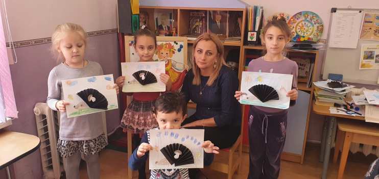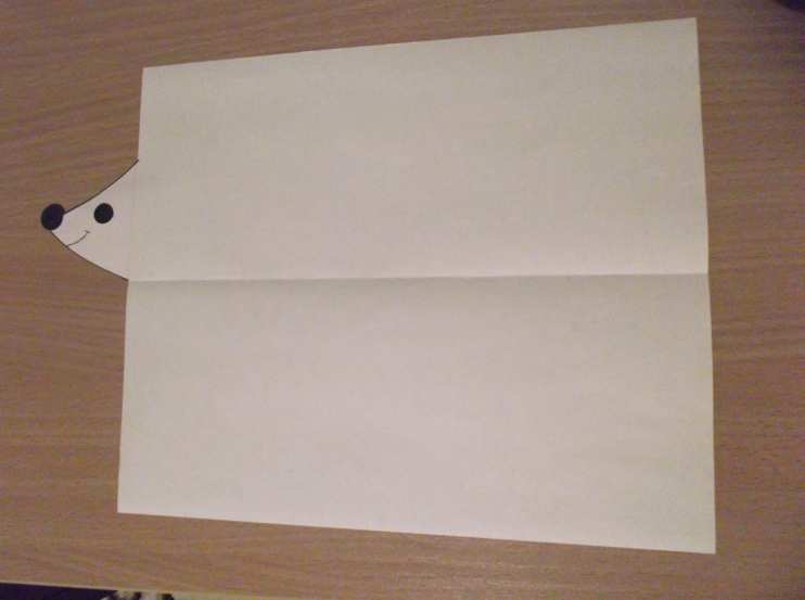 Инструменты и материалы: двусторонняя цветная бумага (желательно – тонированная), ножницы, клей, черный фломастер, мордочка ежа (шаблон)
