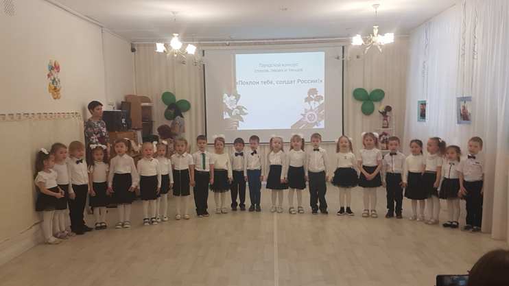 Конкурсанты исполнили вокальное произведение «Армия Российская», муз. Е. Тиличеевой, сл. Н. Найденовой. Юные вокалисты были награждены Дипломом Победителя городского конкурса стихов, песен и танцев «Поклон тебе, солдат России!», в номинации «Детский хор». Выступление на городском конкурсе подарило много ярких и позитивных эмоций всем его участникам: организаторам, конкурсантам, жюри и родителям.