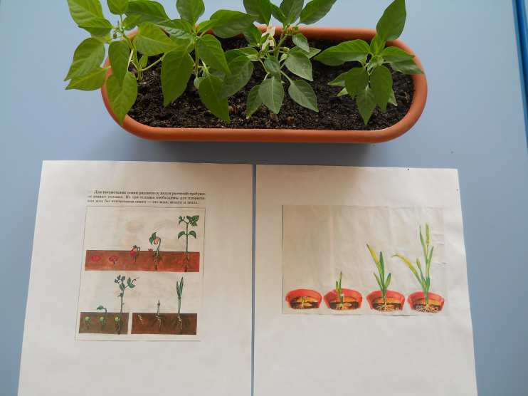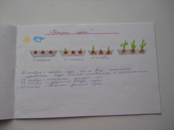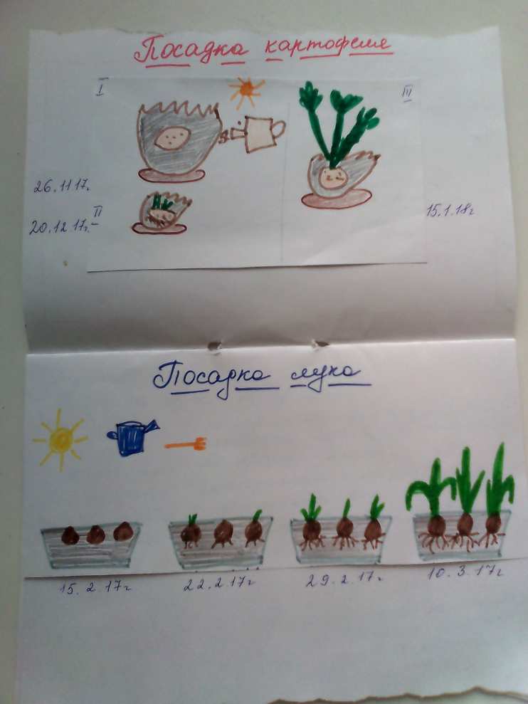 «Огород на окне»: Посадки: лук, чеснок, салат, фасоль, кукуруза, огурцы, укроп, перец сладкий, помидоры, бархатцы. Огород позволяет организовать длительные наблюдения за процессом роста растений, условиями их роста. В процессе экспериментальной деятельности по выращиванию растений ведётся дневник наблюдений, в котором воспитатель совместно с детьми фиксирует сделанные выводы по результатам ежедневного наблюдения.