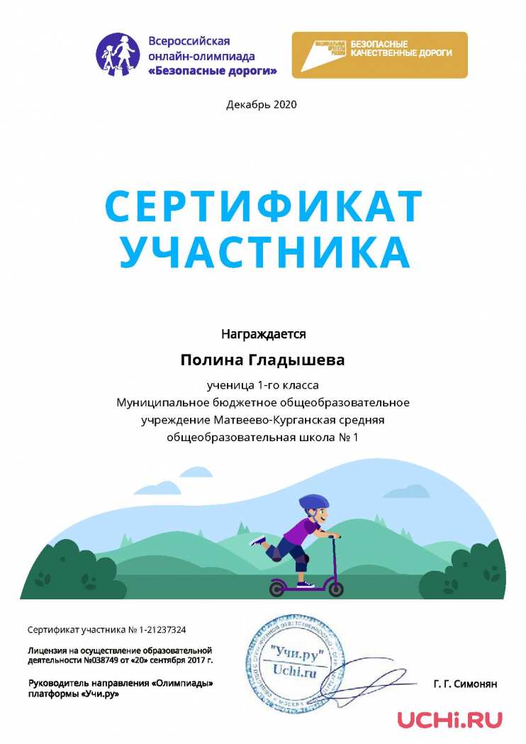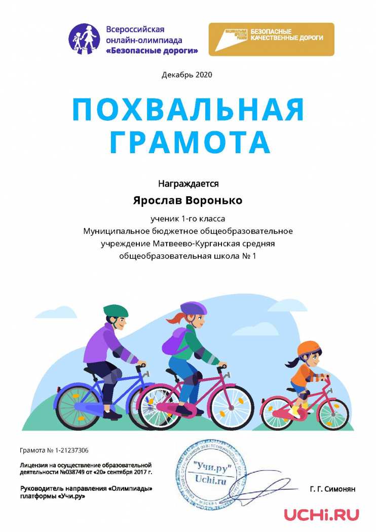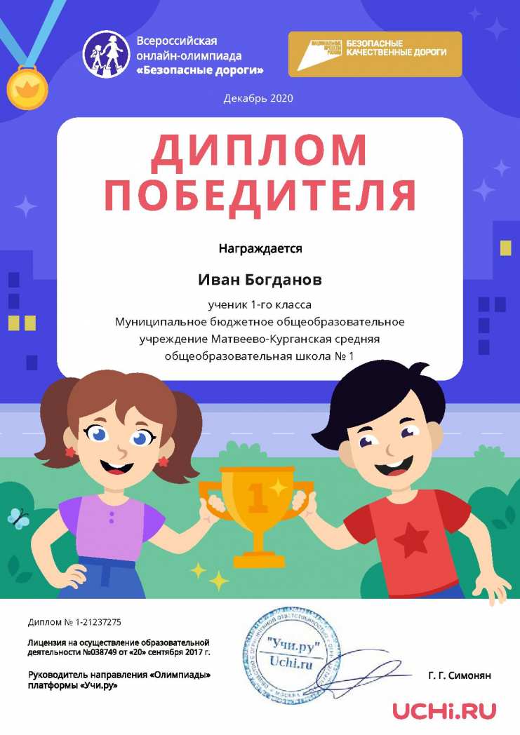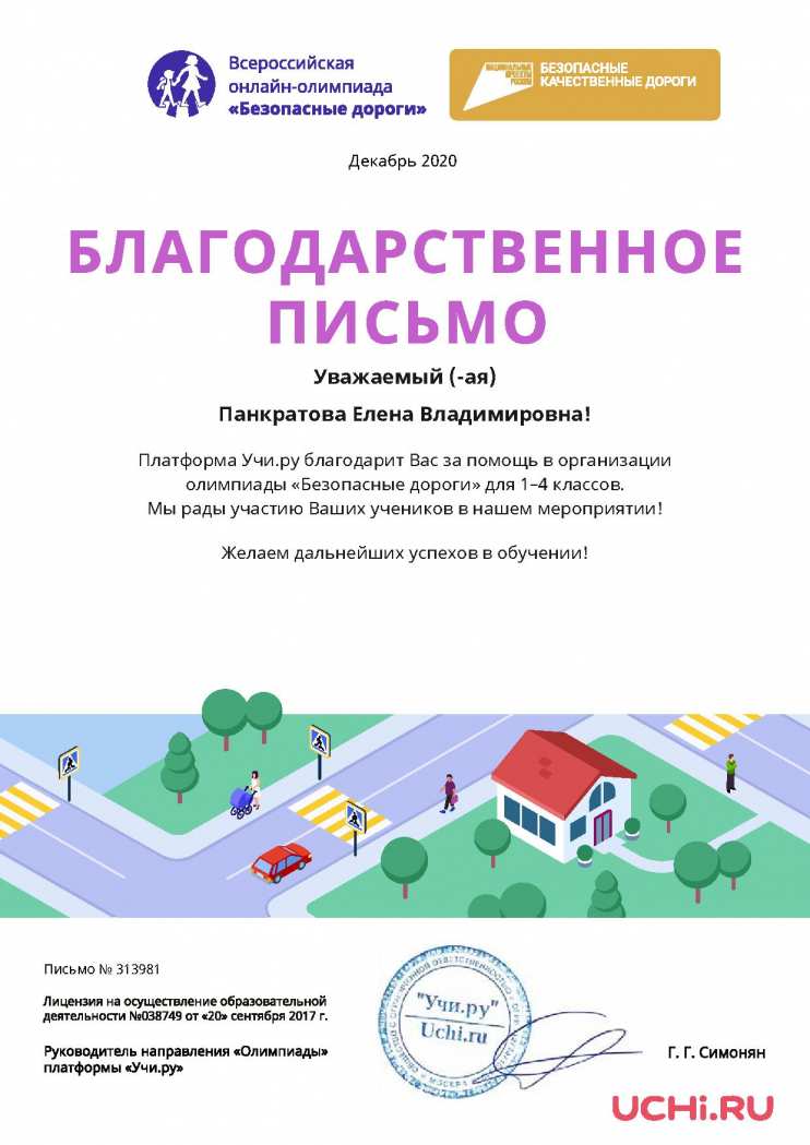 В своей педагогической деятельности я не первый год использую образовательную платформу Учи.ру. Очень нравится и детям, и родителям! Большой помощник учителя. В декабре ребята приняли участие на этой платформе во всероссийской онлайн-олимпиаде «Безопасные дороги». Интерактивные задания позволили проверить знания правил дорожного движения и понимание учениками младшей школы безопасного поведения на дороге в ситуациях, когда они выступают в роли пешехода, пассажира транспортного средства или водителя велосипеда. Ниже результаты участия!
