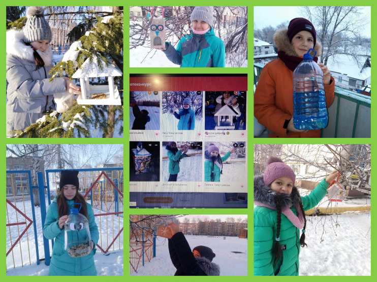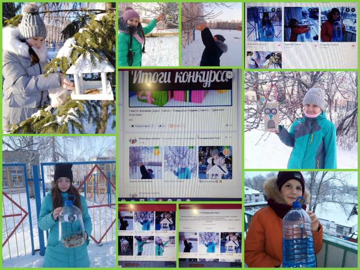 На зимних каникулах, в рамках кружковой работы «Мы — твои друзья», ученики 4 Б класса приняли участие в конкурсе кормушек «Столовая для птиц». На конкурс было выставлено 7 разнообразных кормушек из пластика и картона.