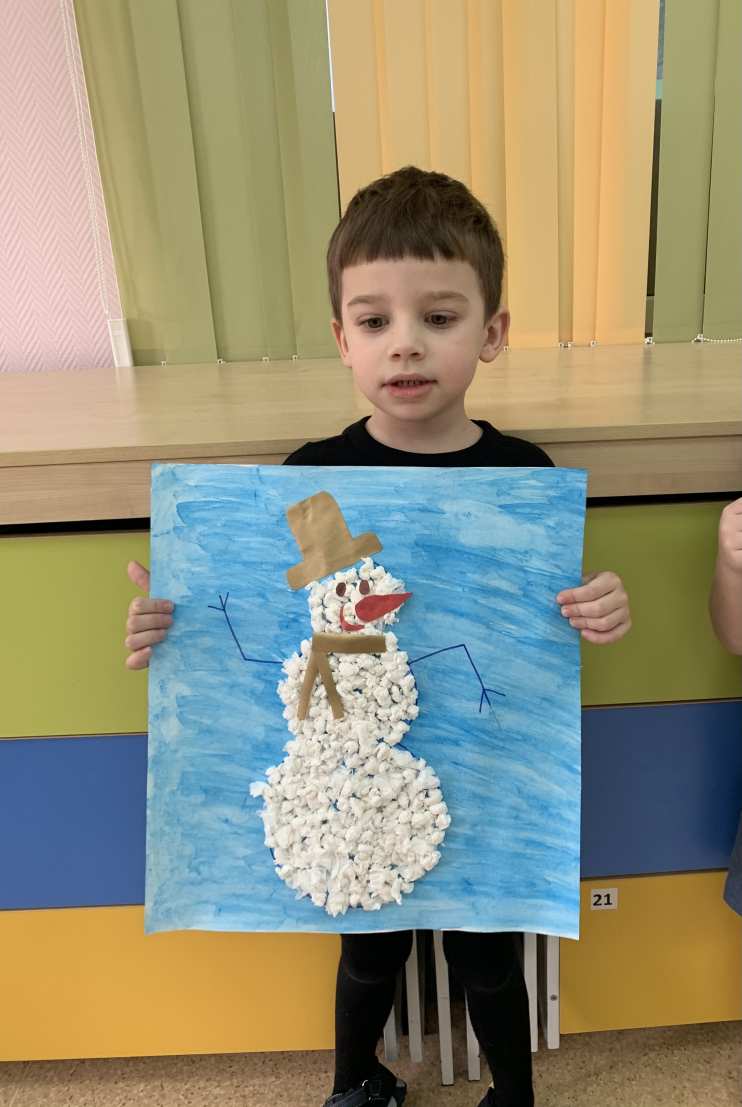 Дети с помощью салфеток в технике торцевания изготовили аппликацию снеговика.