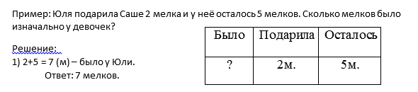 1. Рисунок изображает реальные предметы, о которых говорится в задаче, или условные предметы в виде геометрических фигур.