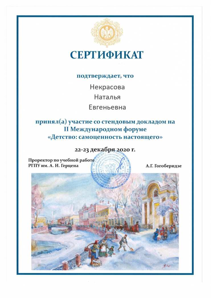 В декабре 2020 г. в г. Санкт-Петербурге на базе Российского государственного педагогического университета им. А.И. Герцена прошел II Международный культурно-просветительский форум «Детство: самоценность настоящего».