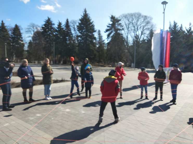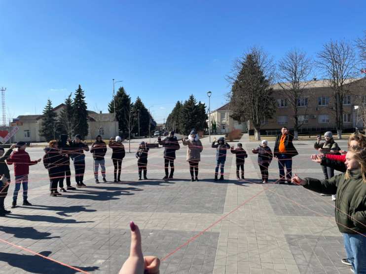 Участники встали в круг, каждый взял оранжевые нитки и передал другому участнику, взявшись за свою нить. В центре круга образовалось множественное переплетение нитей, что символизирует связь волонтеров "Мы вместе".
