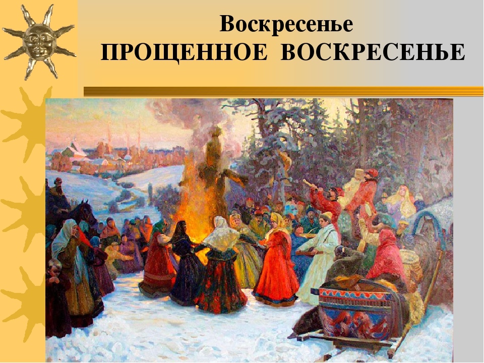 Прощёное воскресенье — последний день Масленицы. В храмах на вечернем богослужении совершается чин прощения (настоятель просит прощения у других священнослужителей и прихожан). Затем и все верующие, кланяясь друг другу, просят прощения и в ответ на просьбу произносят: «Бог простит».