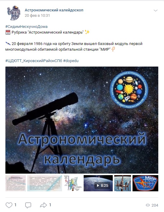 Группа Вконтакте открыта, каждый желающий может получить доступ к информации, принять участие в обсуждениях или сделать репост на свою личную страницу или в группе организации. Приглашаем и вас посетить данную страничку по ссылке https://vk.com/astrokaleidoskop