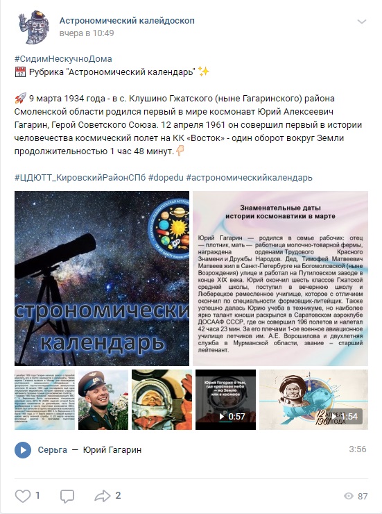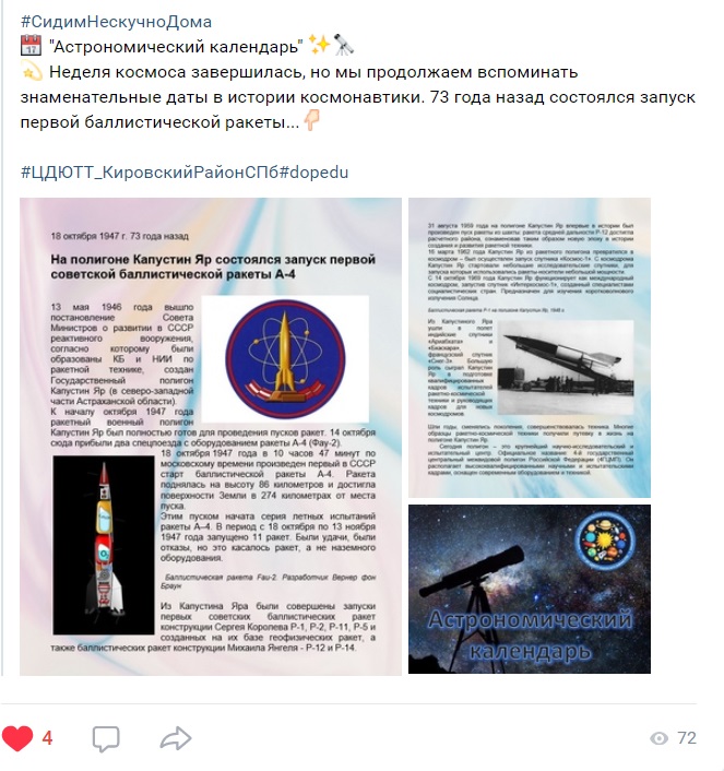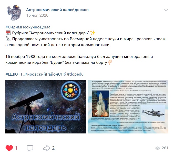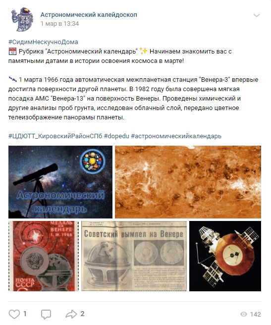 В группе присутствует привлекательный текст, интересно изложенная научная информация, иллюстративный и видео материал, подобранный совместно с заведующим астро-космической лабораторией ЦДЮТТ (чтобы не возникало научных противоречий, и читающий получал актуальные сведения).