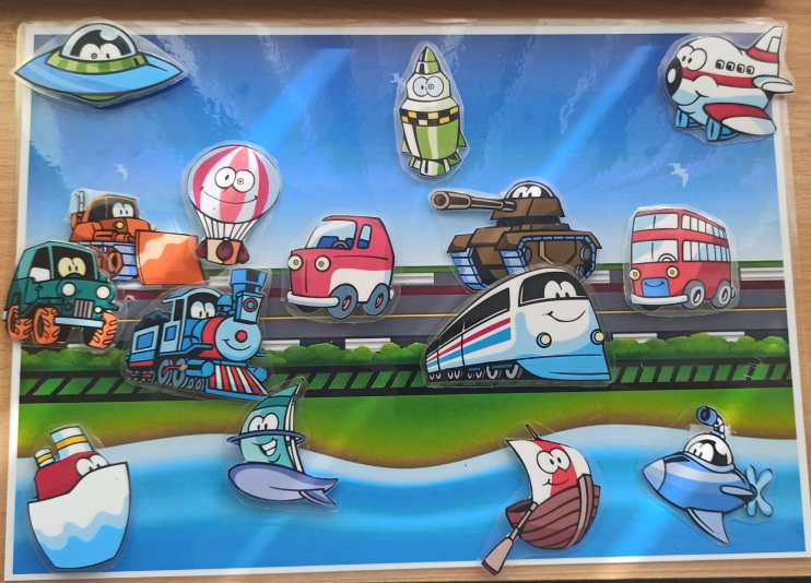 Описание игры: Педагог помещает на столе фон и картинки транспорта и предлагает ребенку назвать картинки, разместить место, где перемещается транспорт. Также можно составить рассказ о дружбе транспорта, так как картинки выполнены как герои историй. Например: ракета – в небе, автобус - на дороге, паровозик - на рельсах, пароходик - на воде и так далее.