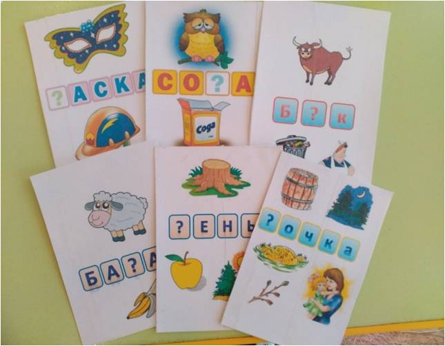 Ребенку дается карточка, на которой нарисованы изображения – слова-квазиомонимы, и написано слово, в котором отсутствует одна буква. Дается задание: ребенку нужно предложить букву, которая может стоять на месте пропуска, и предлагается прочитать, какое слово получится и какая картинка соответствует этому слову.