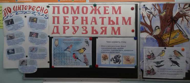 В ходе этой акции было проведено внеклассное мероприятие «Поможем пернатым друзьям» в 4 классе, и ребята к этому мероприятию оформили школьную доску. Из цветной бумаги дети вырезали буквы для надписи и наклеили на ватман. Рядом с двух сторон разместили стенгазеты, в которых рядом с изображением птиц содержится интересная информация о зимующих птицах. Использовали плакаты: «Кроссворд-лесенка», «Чем кормить птиц».