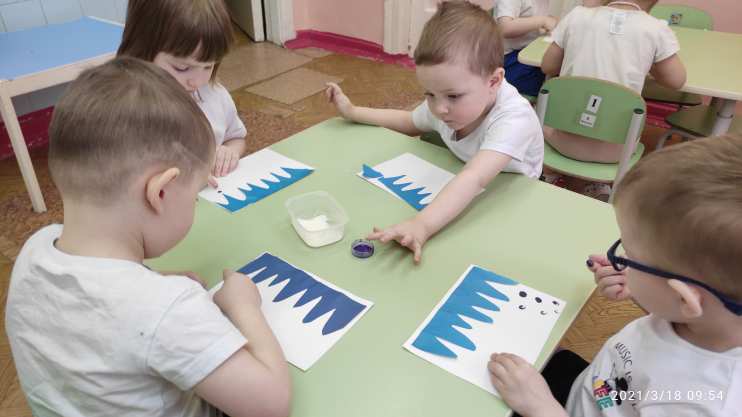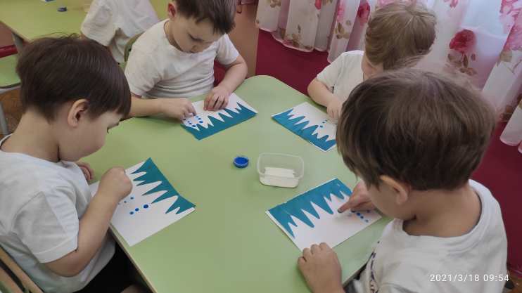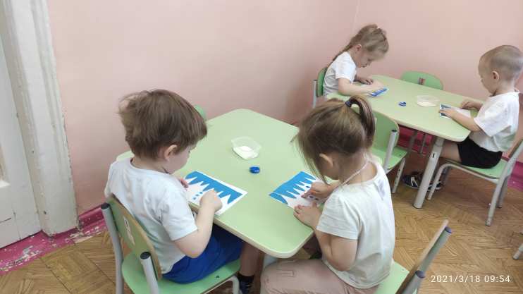 Образовательные: Формировать представление детей о весенних изменениях в природе, о признаках весны, устанавливать простейшие связи; учить наклеивать готовые формы, вызвать интерес к рисованию красками способом примакивания; закреплять знание синего цвета.