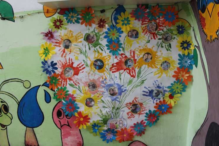 Стенгазета сделана из листов А4 в форме сердца, на котором расположены цветы детей, выполненные в технике рисования ладошками. В середине каждого цветка расположена фотография, показывающая, чья мама и кто из детей рисовал тот или иной цветок.