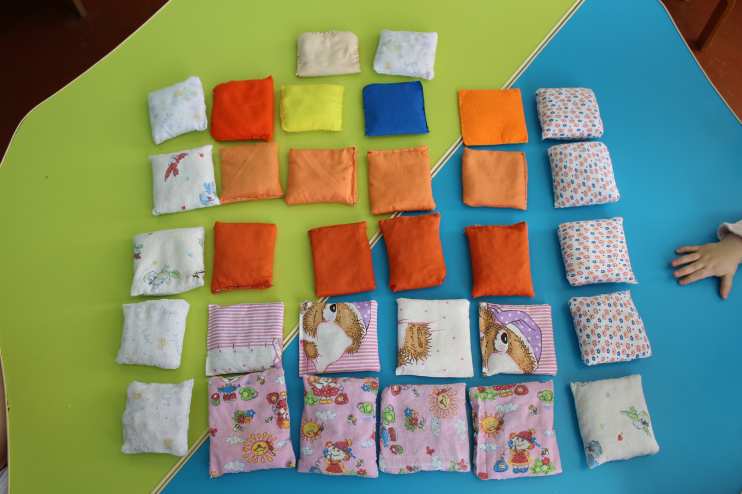 Размеры мешочков 10 на 10 см, а в качестве наполнителей: гречка, рис, горох, тыквенные семечки, фисташки, фасоль, зерна кофе, пластмассовые пульки, макароны, косточки от абрикосов, флис, мелкие ракушки и камушки, шишки.