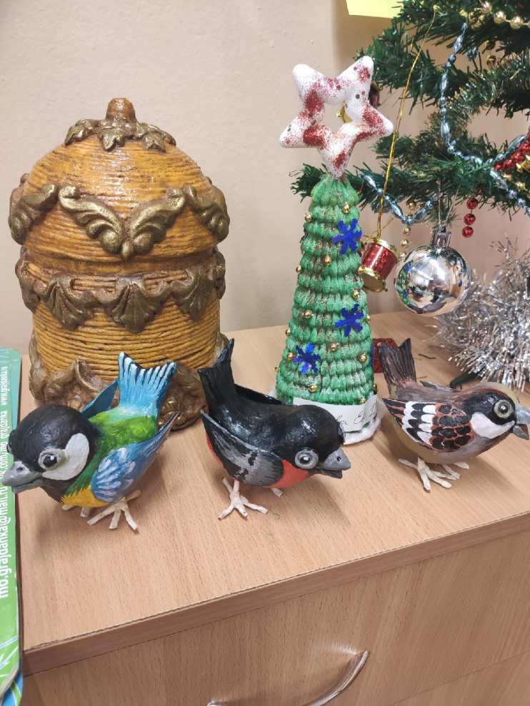 Птички и шкатулка выполнены из макулатуры в технике папье-маше. Для каркаса использована алюминиевая фольга. Фигурки расписаны гуашью и покрыты акриловым лаком. Для шкатулки использован джутовый шпагат. Елочка выполнена из ватных палочек, окрашенных акварелью.