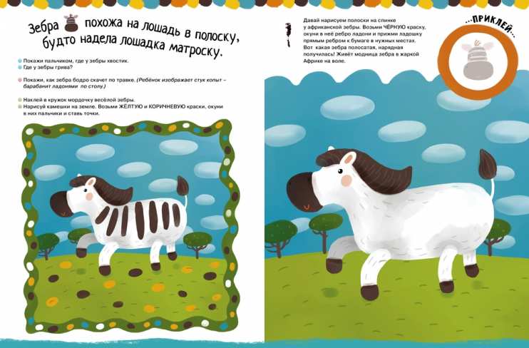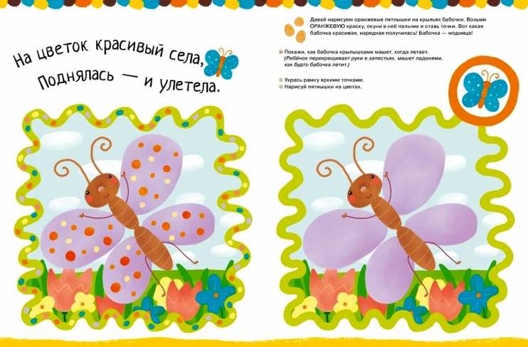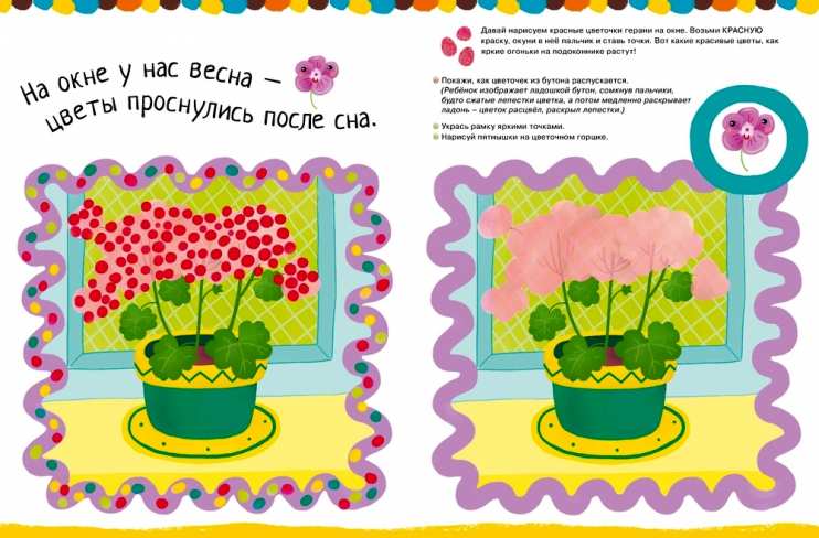 На каждом развороте книжки из серии «Рисуем ладошками и пальчиками» — готовая игра-занятие по рисованию и развитию речи. Все необходимое для игры есть — можно порисовать, прочитать очень приятные двустишия, сосчитать вишенки, узнать новое слово. (В данной серии — 1-3 года — предложено несколько уровней сложности игр-занятий родителей с детьми: 1-й и 2-й уровни). Странички в книге плотные, выдержат любые лужицы красок и не станут просвечивать. Игру можно разнообразить, в зависимости от склонностей и желания малыша, своим вариантом задания (цвет краски, её насыщенность и др.).