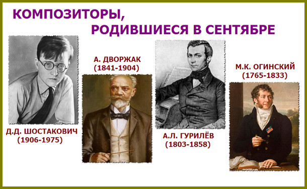 8 сентября 1841 года в мир пришел 2-й после Сметаны чешский классик Антонин Дворжак. Рожденный в семье мясника, он много сил положил на то, чтобы вопреки семейной традиции стать музыкантом. Окончив в Праге Органную школу, композитор смог устроиться альтистом в Чешский Национальный оркестр, а затем органистом в пражскую церковь св. Адальберта. Эта должность позволила ему вплотную заняться композиторской деятельностью. Среди его произведений наиболее известными стали «Славянские танцы», опера «Якобинец», 9 симфония «Из нового света». 13 сентября 1583 года в городе Ферраре, считавшимся в XVI веке одним из центров музыкальной культуры, родился выдающийся мастер эпохи барокко, основоположник итальянской органной школы Джироламо Фрескобальди. Он работал клавесинистом и органистом в разных церквях, при дворах знатных господ. Известность Фрескобальди принесли опубликованные в 1603 году 3 канцоны и Первая книга мадригалов. В то же время композитор занял очень высокий пост органиста собора Св. Петра в Риме, где прослужил до самой смерти. На его произведениях учились такие мастера, как И.С. Бах и Д. Букстехуде.
