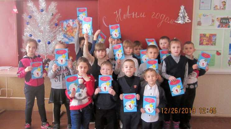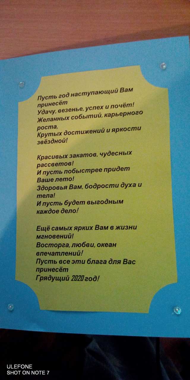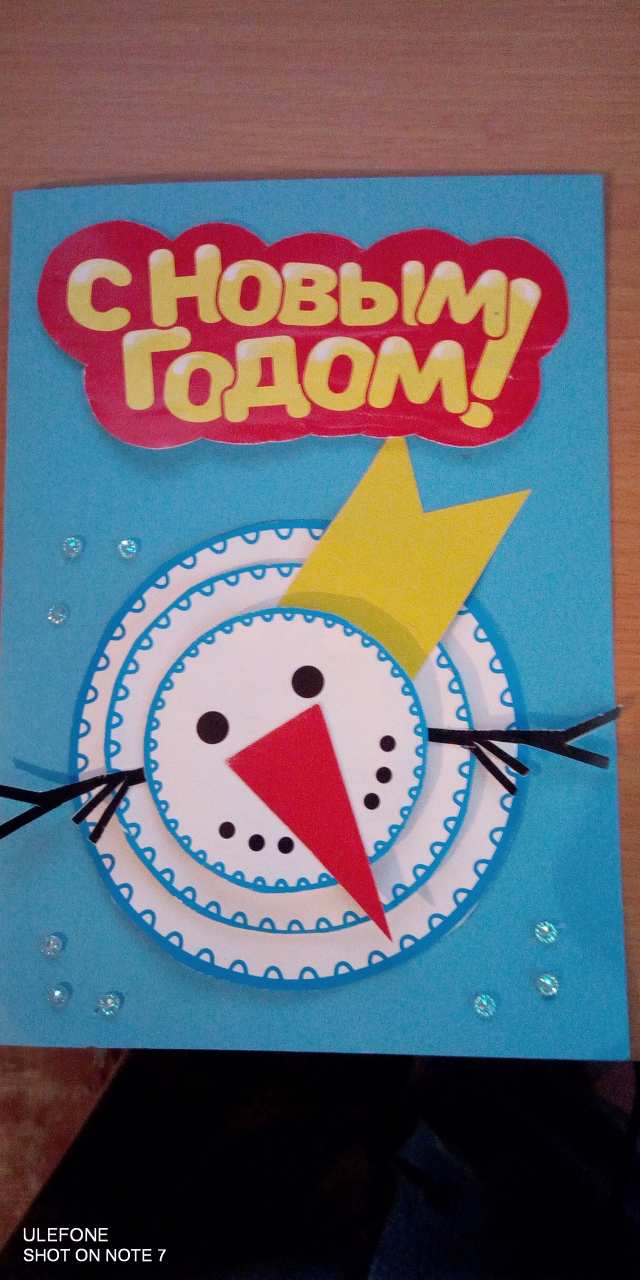 На лицевой стороне открытки сверху наклеиваем надпись (все наклейки делать на толстый двойной скотч!), ниже клеим белые круги один на один, затем шарфик, носик и всё остальное. Руки-веточки вырезаем произвольно из коричневого картона. На внутренней стороне открытки - новогоднее поздравление в стихах или прозе (кому что понравится). Можно украсить блёстками. Конечно, дети 1 класса делали открытки по шаблонам.