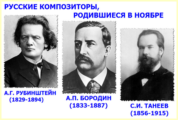 Под занавес месяца, 28 ноября 1829 г. мир увидел будущий организатор музыкальной жизни в России, композитор, создававший шедевры, гениальный пианист, Антон Рубинштейн. Его портреты писали лучшие русские художники: Репин, Врубель, Перов, Крамской. Поэты посвящали ему стихи. Фамилия Рубинштейна встречается в многочисленных переписках современников. Он концертировал как дирижер и пианист по всей Европе, США, а также стал инициатором открытия первой в России Петербургской консерватории, которую сам и возглавил.