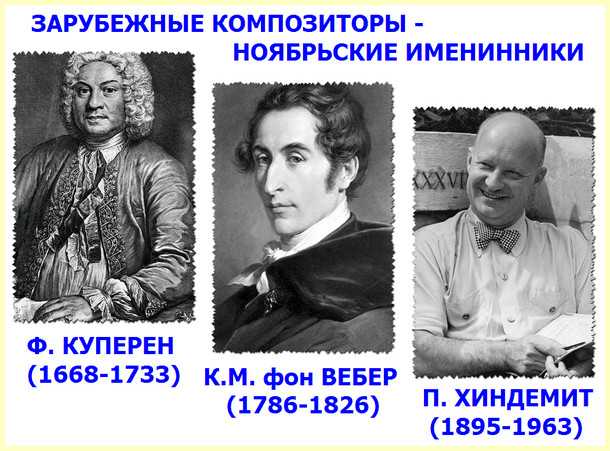Самой «юной» знаменитостью, появившейся на свет 10 ноября 1668 г., стал Франсуа Куперен. Представитель известной многим династии музыкантов, он сделал фамилию знаменитой. Его неповторимый клавесинный стиль завораживает своей утонченностью, изяществом и отточенностью. Его рондо и вариации обязательно входят в концертный репертуар ведущих исполнителей. 12 ноября 1833 г. миру явился незаурядный человек, гениальный композитор, талантливый ученый, педагог, Александр Бородин. В его творчестве органично сплелись и богатырский размах, и тонкая лирика. Его увлеченность наукой и музыкой притягивала и собирала вокруг композитора множество замечательных людей: композиторов, ученых, литераторов.