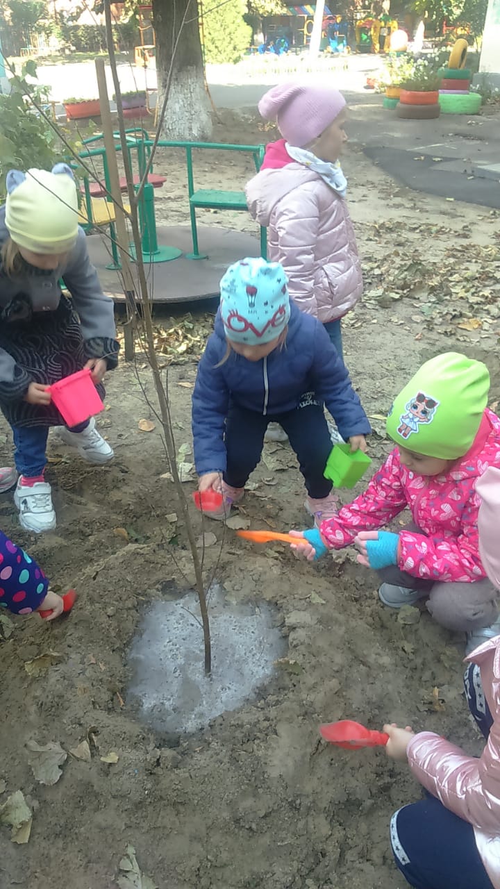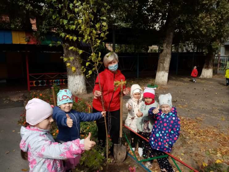 В прошлом году были высажены на территории детского сада "Тополек": катальпы, дубы и клены. Ухаживать за деревьями нужно обязательно: не только посадить, но и обильно поливать (например, березы очень любят воду), рыхлить землю вокруг ствола, закрепить ствол березки, чтобы спасти от повреждения в ветреные дни. И весной, покидая сад, ребята увидят, как зеленые друзья будут радовать малышей своей тенью.