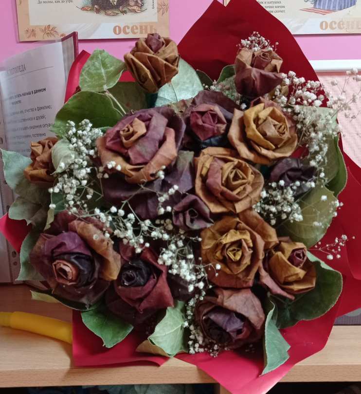 Букет из роз, сделанных из листьев клена и засушенной зелени, используемой в создании букетов. Букет использовался в качестве поделки из природного материала на "Праздник Осени" в детский сад.